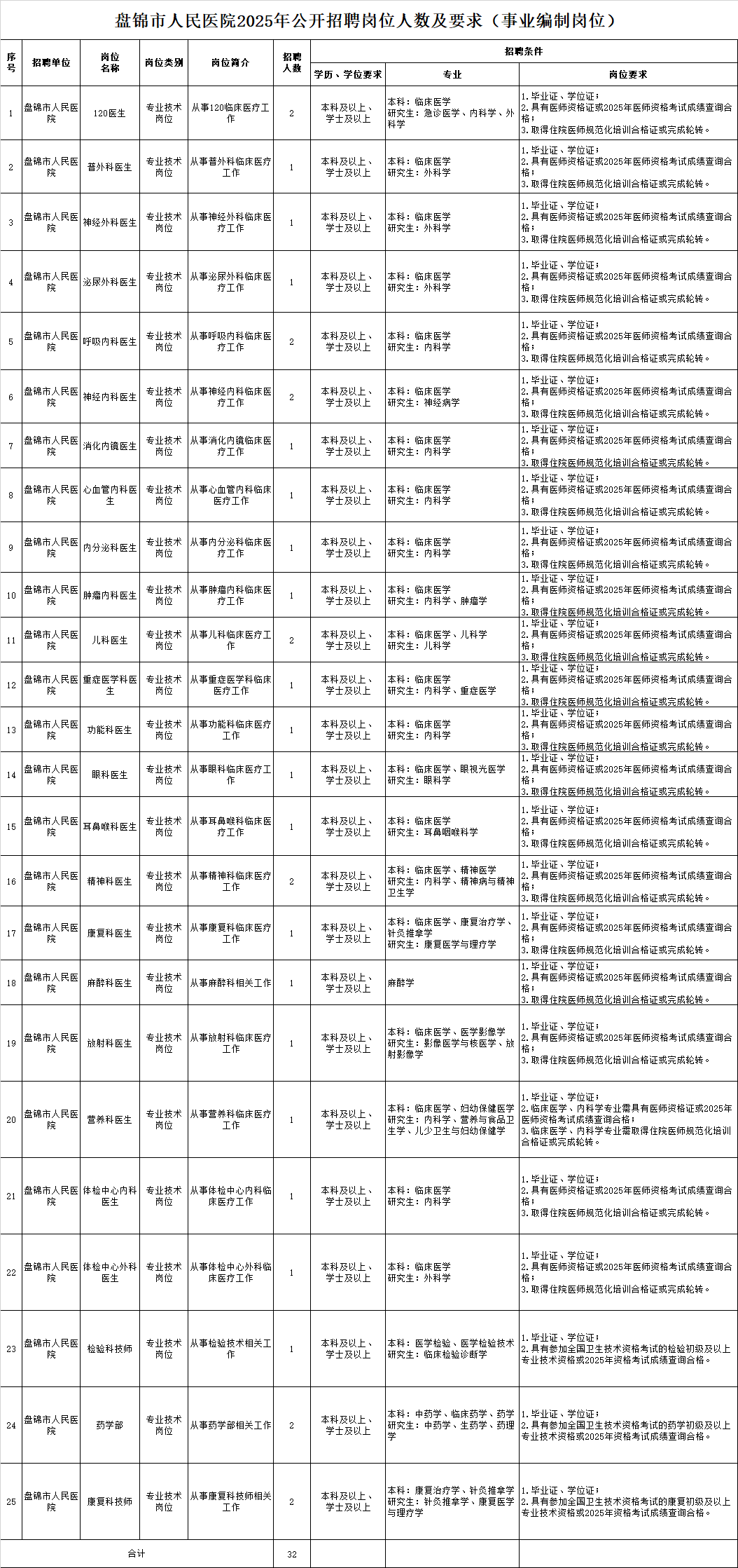 1.盤錦市人民醫(yī)院2025年公開(kāi)招聘崗位人數(shù)及要求(事業(yè)編制崗位)
