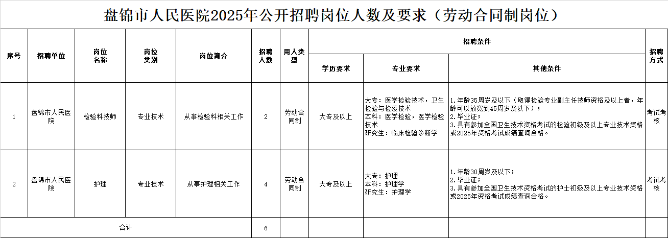 3.崗位所需要的其他條件,詳見(jiàn)《盤錦市人民醫(yī)院2025年公開(kāi)招聘崗位人數(shù)及要求(勞動(dòng)合同制崗位)》(附件2)。