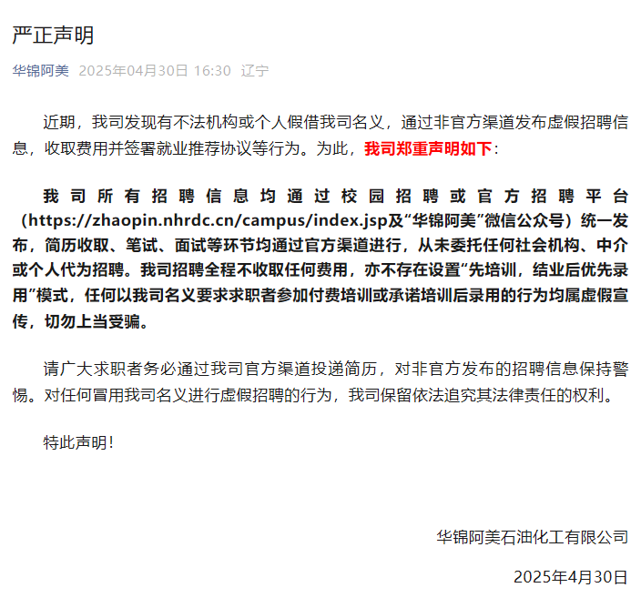 近年來,隨著就業(yè)市場競爭加劇,國有企業(yè)因其穩(wěn)定性與福利保障成為求職者眼中的“香餑餑”。然而,這一需求卻被不法分子利用,催生出虛假招聘、收費內推、暗箱操作等亂象。2025年4月30日,華錦阿美石油化工有限公司發(fā)布嚴正聲明,揭露虛假招聘騙局,呼吁求職者通過官方渠道投遞簡歷,切勿輕信收費承諾。這一聲明不僅是對企業(yè)聲譽的維護,更折射出當前國企招聘中亟待解決的系統(tǒng)性難題。