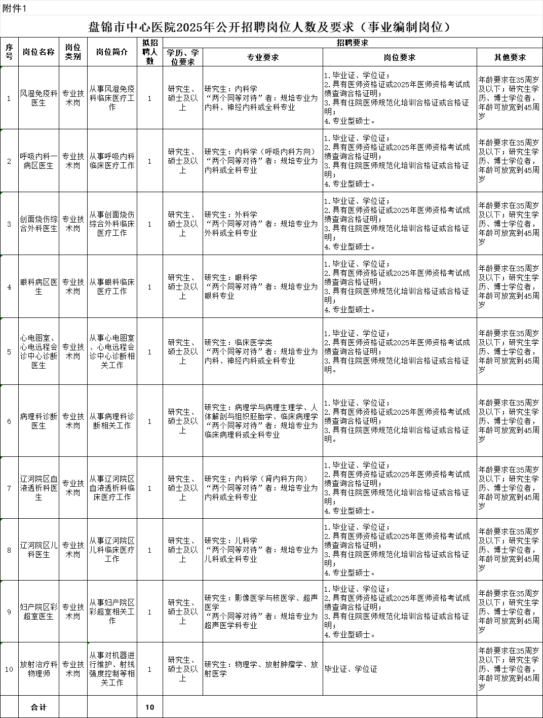 1.盤錦市中心醫(yī)院2025年公開招聘崗位人數(shù)及要求(事業(yè)編制崗位)