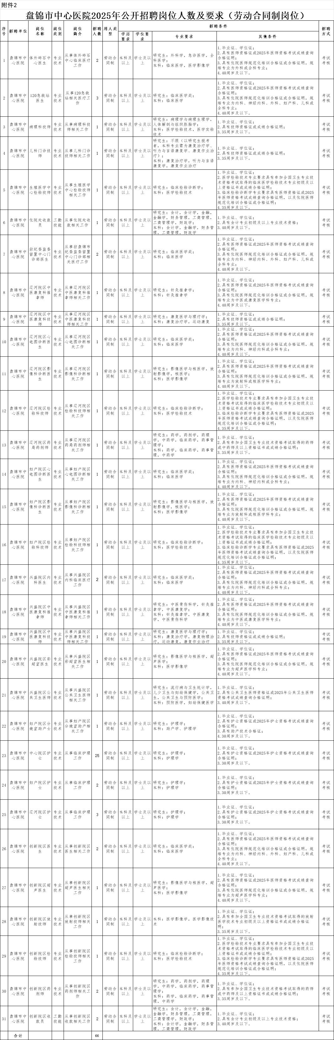2.盤錦市中心醫(yī)院2025年公開招聘崗位人數(shù)及要求(勞動(dòng)合同制崗位)